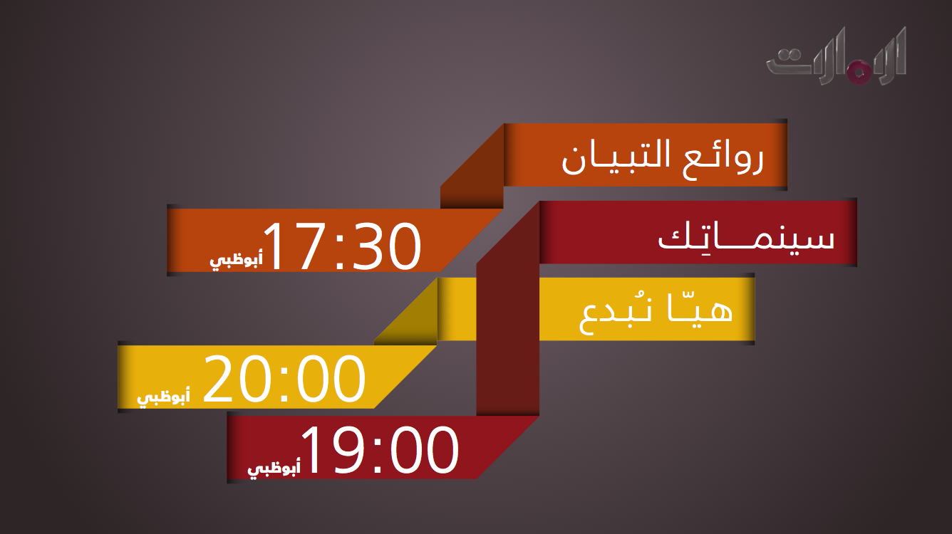 Commissioned by Abu Dhabi Media Corporation as part of re-branding package for multiple channels. Client received color palette and preferred combinations. Delivered Design and layout for on-screen menus(upcoming shows, show timings) - Below is the animated version produced by third party.
